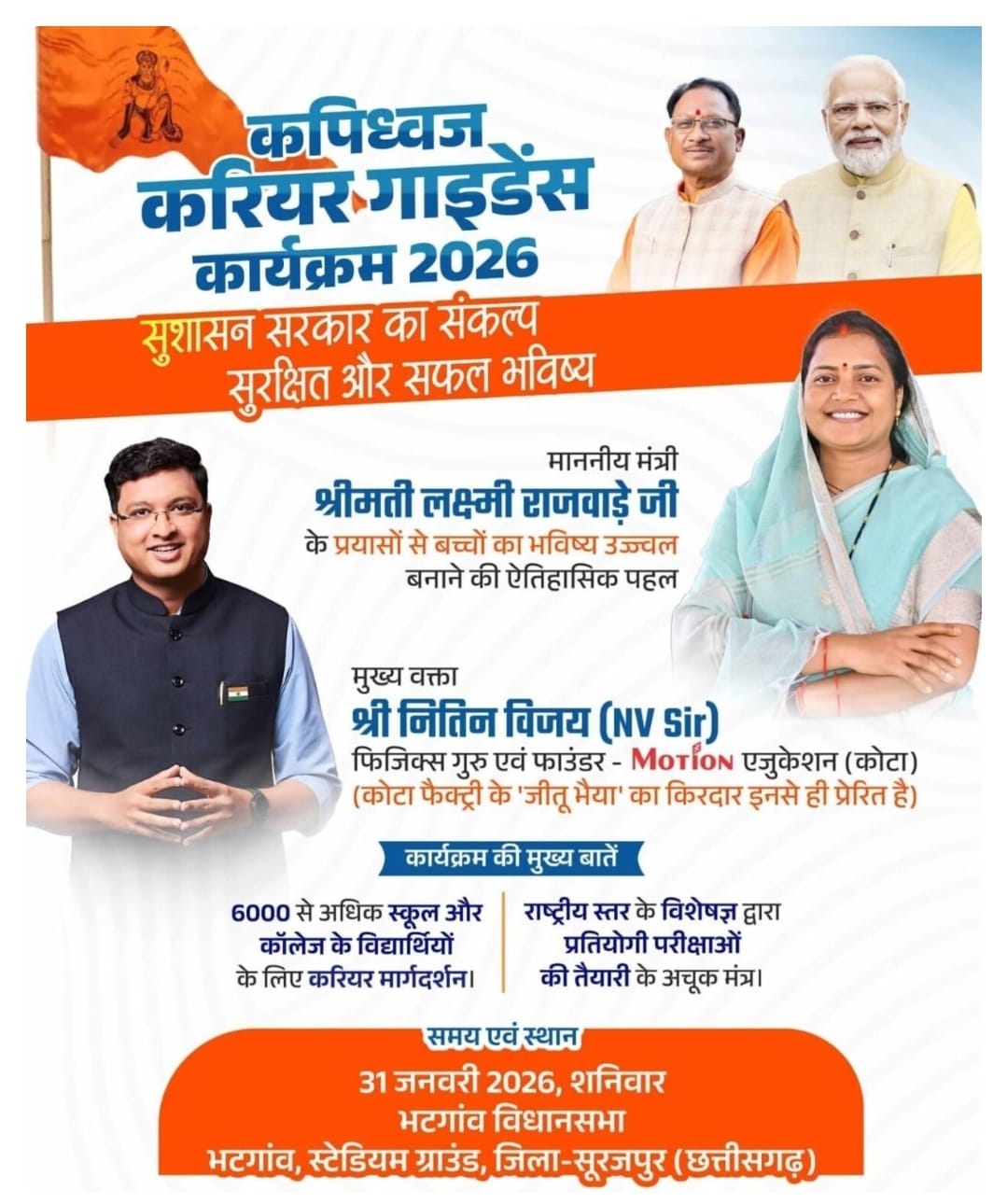 सूरजपुर/31 जनवरी 2026/ शासकीय नवीन महाविद्यालय चांदनी बिहार पुर के राष्ट्रीय सेवा योजना इकाई द्वारा कार्यक्रम अधिकारी धीरेंद्र कुमार जायसवाल के अध्यक्षता में रासेयो विशेष शिविर के दूसरे दिवस पर परियोजना कार्य के दौरान स्वयंसेवकों ने ग्राम ठाड़पाथर के पारा मोहल्ले में जाकर स्वच्छता का संदेश दिया साथ ही था ग्राम के मुख्य मार्ग के […]
