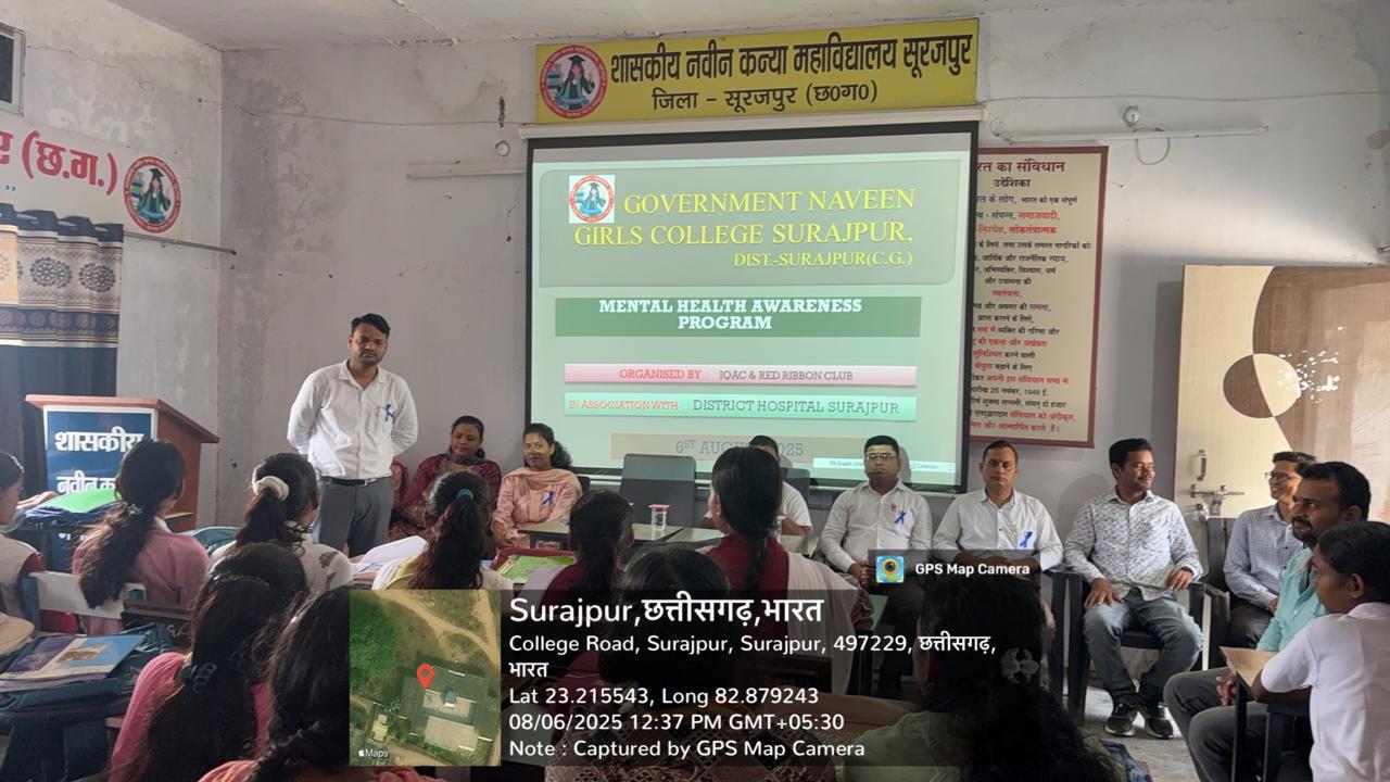 सूरजपुर.- सूरजपुर नगर के शासकीय कन्या महाविद्यालय में आइक्यूएसी ,रेड क्रॉस सोसाइटी एवं रासेयो के तत्वावधान में मानसिक स्वास्थ्य जागरूकता कार्यक्रम का आयोजन किया गया। संस्था के प्राचार्य बृजलाल साहू ने छात्राओं को मानसिक एवं शारीरिक रूप से शैक्षणिक गतिविधियों में शामिल होने के लिए प्रेरित किया साथ ही पाठ्येतर गतिविधियों में भी तन एवं मन के साथ भागीदारी सुनिश्चित करने के लिए प्रोत्साहित किया। इस कार्यक्रम में मनोरोग विशेषज्ञ सचिन मातुरकर एवं सामाजिक कार्यकर्ता प्रियंका मंडल के द्वारा मानसिक स्वास्थ्य संबंधी विभिन्न पहलुओं को विद्यार्थियों के साथ साझा किया गया। वर्तमान दौर में अधिकांश युवा मानसिक स्वास्थ्य संबंधी समस्याओं से जूझ रहे हैं इसका सीधा असर विद्यार्थियों के शैक्षणिक गतिविधियों पर पढ़ रहा है साथ ही वह अपने मूल उद्देश्यों से भटक रहे हैं । आज के दौर में मानसिक स्वास्थ्य राष्ट्रीय चिंता का विषय है। इन समस्त भावनात्मक समस्या संबंधी प्रश्नों के उत्तर विशेषज्ञों द्वारा दिए गए। इस क्रम में छात्राओं से मानसिक स्वास्थ्य संबंधी प्रश्न पूछ कर उनके जिज्ञासाओं का समाधान किया गया। इस मौके पर महाविद्यालय के प्राध्यापक दिग्विजय सिंह, पुनीत गुप्ता ,रोहित सेठ ,डॉ धनंजय पांडे ,पूजांजली भगत, दिव्यादित्य सिन्हा एवं सुप्रिया सिंघल सहित समस्त छात्राएं,शैक्षणिक एवं गैर शैक्षणिक स्टाफ उपस्थित रहे।