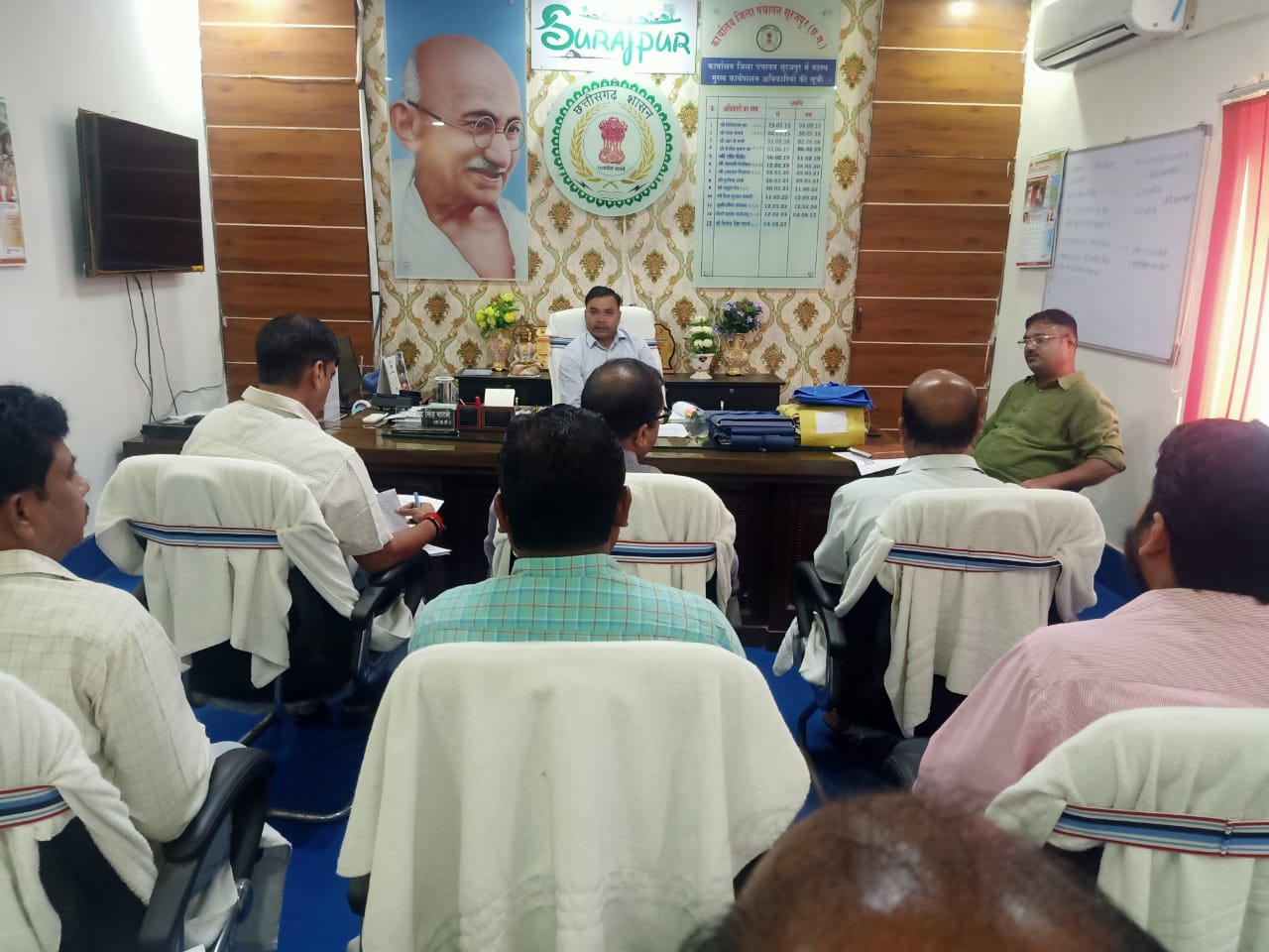सूरजपुर/vocg.24…/ जिला पंचायत सूरजपुर में आज राष्ट्रीय स्तर की मॉनिटरिंग टीम के सदस्य श्री सरवत हुसैन एवं श्री पंकज सोलंकी द्वारा समीक्षा बैठक आयोजित की गई। बैठक में मुख्य कार्यपालन अधिकारी, जिला पंचायत सूरजपुर श्री विजेन्द्र सिंह पाटले सहित विभिन्न विभागों के अधिकारी उपस्थित रहे।