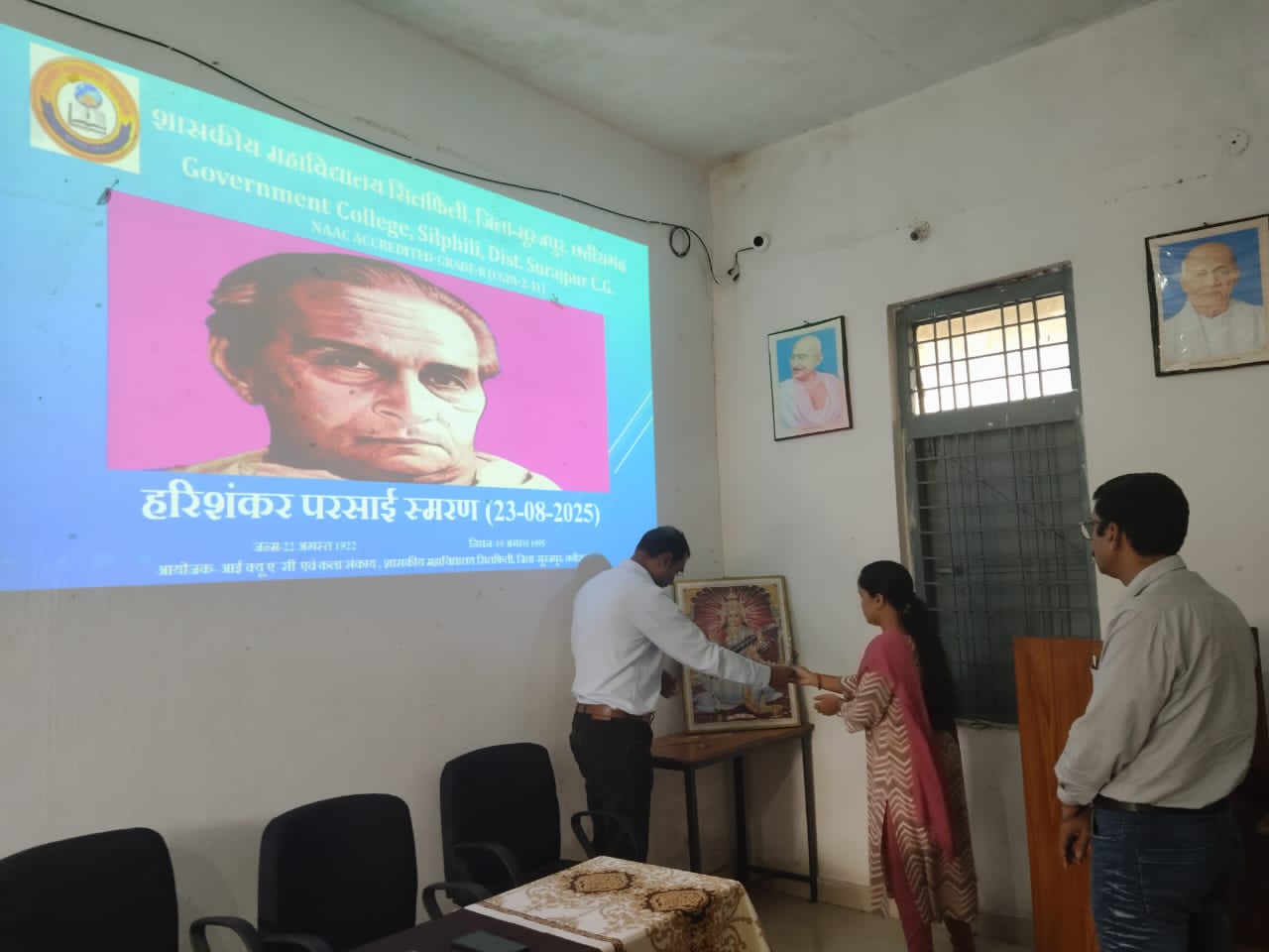 सूरजपुर/ 24 अगस्त 2025/ शासकीय महाविद्यालय सिलफिली में व्यंग्य सम्राट हरिशंकर परसाई की जयंती के अवसर पर हरिशंकर परसाई स्मरण का आयोजन किया गया। कार्यक्रम महाविद्यालय के प्राचार्य श्री अमित सिंह बनाफर की अध्यक्षता में संपन्न हुआ। कार्यक्रम का आरंभ प्राचार्य तथा महाविद्यालय के वरिष्ठ प्राध्यापकों द्वारा संस्कृति की देवी माँ सरस्वती के छायाचित्र पर दीप और धूप प्रज्वलन से हुआ। सर्वप्रथम महाविद्यालय की छात्रा अलामिका ने हरिशंकर परसाई का संक्षिप्त जीवन तथा साहित्यिक परिचय प्रस्तुत किया। बी ए तृतीय सेमेस्टर की छात्राओं मीनाक्षी तथा संजना ने परसाई के व्यंग्य ‘बेईमानी की परत का पाठ कर विद्यार्थियों को देश में जड़ जमाए बेकारी तथा मरीची की समस्या तथा शासन-प्रशासन की बेरोजगारों के प्रति उदासीनता के भाव से अवगत कराया। कार्यक्रम के दौरान हरिशंकर परसाई के निबंध ‘मोलाराम का जीव का शैक्षिक वीडियो यूट्यूब के माध्यम से प्रोजेक्टर द्वारा प्रस्तुत किया गया। बी ए अंतिम वर्ष की छात्रा जैतून निशा ने मुनाफाखोरों की चालाकी से संबंधित परसाई के व्यंग्य ‘उखड़े खंभे’ का पाठ किया।