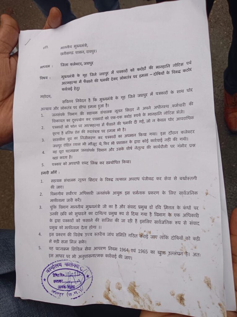 मुख्यमंत्री के गृह ज़िले जशपुर में पत्रकारों पर नोटिस थोपने और मानहानि का मुकदमा दर्ज कराने की धमकी के विरोध में जिलेभर के पत्रकार संगठनों ने शुक्रवार को ज़िला कलेक्टर कार्यालय पहुंचकर जोरदार विरोध दर्ज कराया। इस दौरान उन्होंने कलेक्टर के माध्यम से मुख्यमंत्री को एक ज्ञापन सौंपा, जिसमें जनसंपर्क विभाग की सहायक संचालक नूतन सिदार के खिलाफ कठोर कार्रवाई की मांग की गई है।