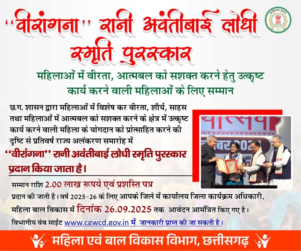सूरजपुर/15 सितंबर 2025/ छत्तीसगढ़ शासन द्वारा महिलाओं, विशेष कर वीरता, शौर्य, साहस तथा महिलाओं में आत्मबल को सशक्त करने के क्षेत्र में उत्कृष्ट कार्य करने वाली राज्य की महिलाओं को प्रतिवर्ष ‘‘वीरांगना‘‘ रानी अवंतीबाई लोधी स्मृति पुरस्कार प्रदान किया जाना है।