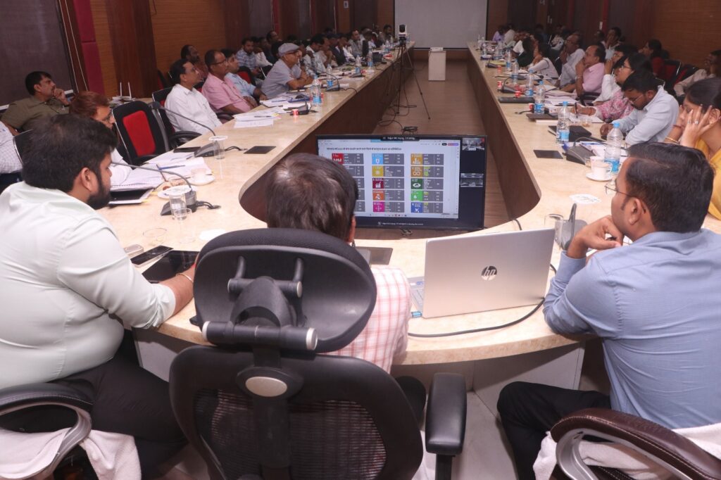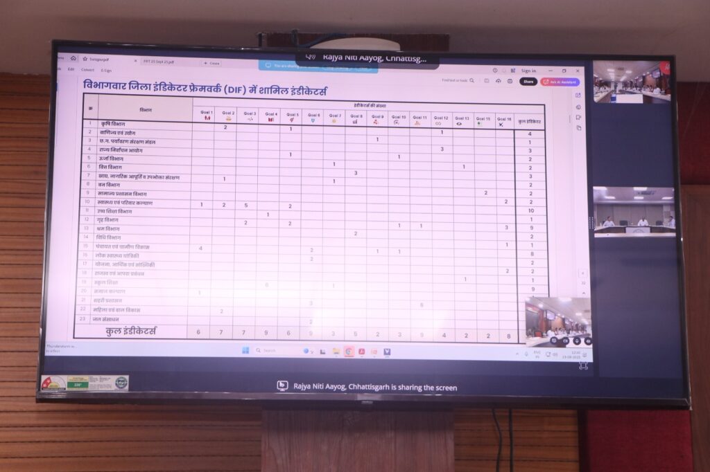 सूरजपुर/23 सितंबर 2025/ आज जिला संयुक्त कार्यालय के सभाकक्ष में राज्य नीति आयोग छत्तीसगढ़ के द्वारा सतत विकास लक्ष्य (एसडीजी) की जिला स्तरीय प्रगति के संबंध में वीडियो कॉन्फ्रेसिंग रखी गई थी। जिसमें जिला सूरजपुर महत्वपूर्ण इंडिकेटर के संबंध में विचार-विर्मस व चर्चा किया गया। जिसमें जिले के विशेष ध्याने देने संकेतक त्रुटि प्रवण वर्ष 2025 में कि गई एंट्री में संकेतक जैसे महत्वपूर्ण बिंदुओं पर चर्चा की गई। इसके साथ ही छत्तीसगढ़ अंजोर -’विजन/2047श् से परिचय कराया गया। छत्तीसगढ़ के मुख्य प्रथमिकता, नागरिक की सुख सुविधा, आर्थिक विकास, सुशासन और निवेश संबंधी लक्ष्य, अल्पकालिक, मध्यकालिका, दीर्घकालिक और लक्ष्यों का रोडमैप इत्यादि बिंदुओं पर विस्तृत चर्चा की गई। इसके साथ ही विजन तैयार करने की प्रक्रिया में आवश्यक जानकारी प्रदान की गई। वीडियो कॉन्फ्रेंसिंग में रायपुर से राज्य नीति आयोग से सदस्य सचिव श्री आशीष कुमार भट्ट व अन्य तथा जिले से कलेक्टर श्री एस जयवर्धन व जिला स्तरीय अन्य संबंधित अधिकारी उपस्थित थे।