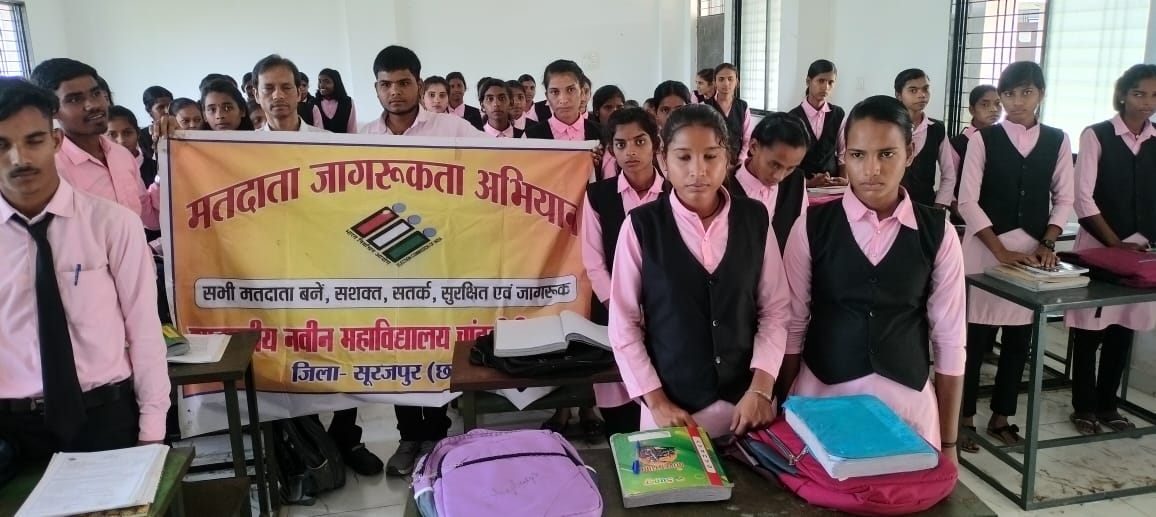 सूरजपर – जिला निर्वाचन अधिकारी श्री एस. जयवर्धन के निर्देशानुसार शासकीय नवीन महाविद्यालय चांदनी बिहारपुर में एक दिवसीय मतदाता जागरूकता शिविर का आयोजन किया गया। जिसमें प्रोफ़ेसर स्विप नोडल एवं रासेयो कार्यक्रम अधिकारी श्री धीरेन्द्र कुमार जायसवाल के अध्यक्षता एवं संचालन में संपन्न कराया गया। जिसमें फॉर्म 6 के कुल 68 फॉर्म का वितरण किया गया। इस शिविर में तहसील कार्यालय बिहारपुर के उमेश तिवारी एवं उनके साथ त्रिनेश्वर प्रताप जायसवाल का विशेष सहयोग रहा, महाविद्यालय के शिक्षक सचिन कुमार मिंज, राम निवास पटेल, पिंटू कुमार गुप्ता कैंपस एंबेसडर शिवम तिवारी एवं अन्य छात्र रूपेश, रविन्द्र, अमित के साथ सभी छात्र छात्राओ का विशेष सहयोग रहा। शिविर के माध्यम से छात्र-छात्राओं के अपने आसपास टोला मोहल्ला गांव तक मतदाता जागरूकता को प्रसारित करने का प्रयास किया गया।