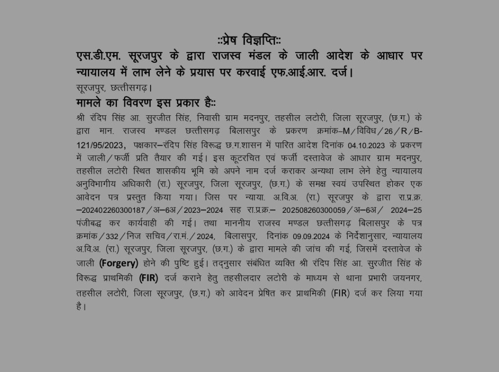 श्री रदिप सिंह, निवासी ग्राम मदनपुर, तहसील लटोरी के द्वारा मान राजस्व मण्डल छत्तीसगढ़ बिलासपुर के प्रकरण क्रमांक-M/ विविध /26/R/B-121/95/2023, पक्षकार-रदिप सिंह विरूद्ध छग शासन में पारित आदेश दिनांक 04.10.2023 के प्रकरण में जाली फर्जी प्रति तैयार की गई। इस कूटरचित एवं फर्जी दस्तावेज के आधार ग्राम मदनपुर,तहसील लटोरी स्थित शासकीय भूमि को अपने नाम दर्ज कराकर अन्यथा लाभ लेने हेतु न्यायालय अनुविभागीय अधिकारी (रा) सूरजपुर, जिला सूरजपुर, (छ.ग.) के समक्ष स्वयं उपस्थित होकर एक आवेदन पत्र प्रस्तुत किया गया। जिस पर न्याया. अ.वि.अ. (रा.) सूरजपुर के द्वारा रा.प्र.क्र.