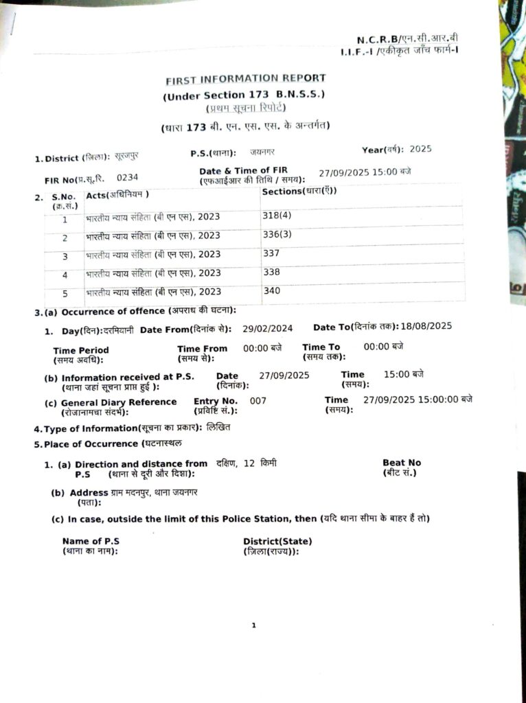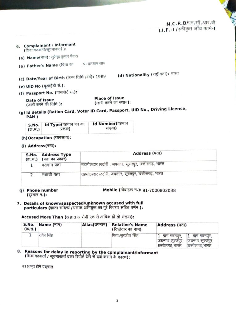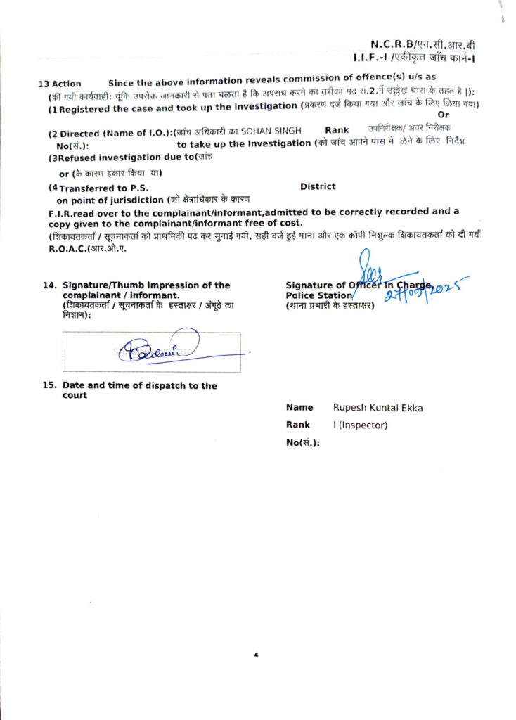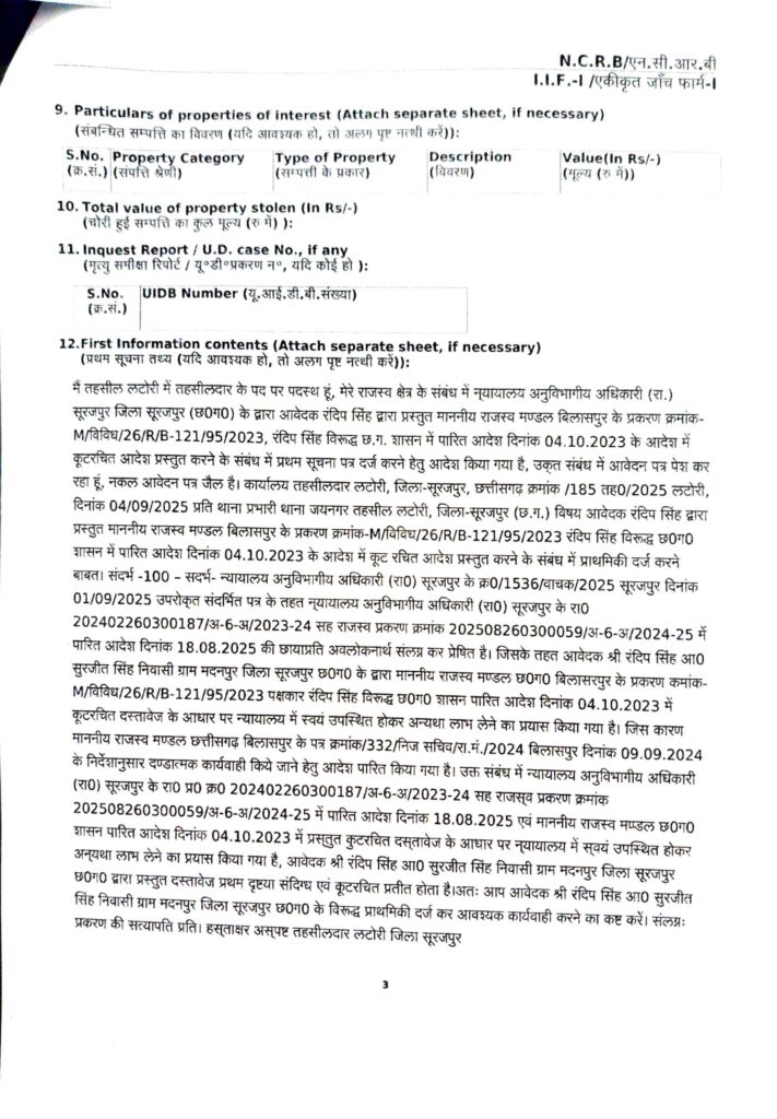 तहसील लटोरी, जिला सूरजपुर, (छ.ग) को आवेदन प्रेषित कर प्राथमिकी (FIR) दर्ज कर लिया गया है।