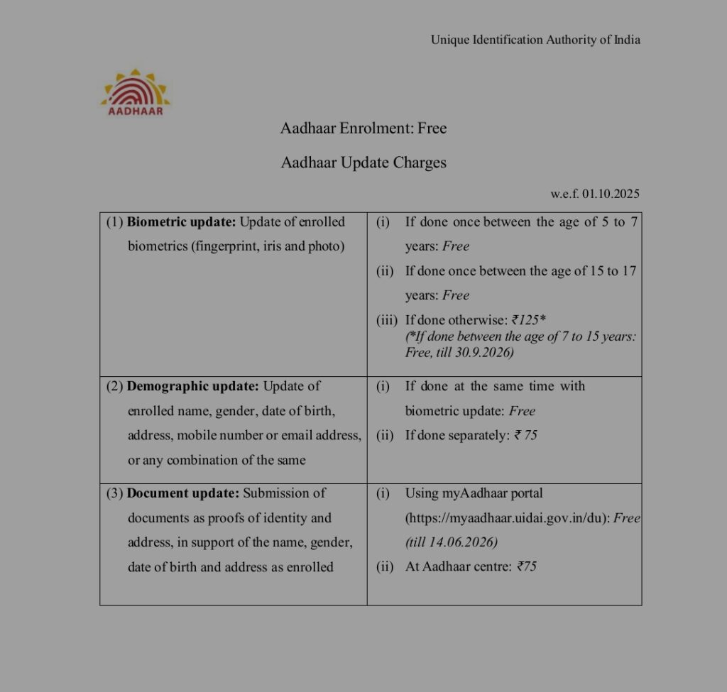 सूरजपुर – 01 अक्टूबर 2025 से 30 सितंबर 2028 तक विभिन्न आधार सेवाओं के लिए नया शुल्क प्रभावी होगा। यह बदलाव नागरिकों को बेहतर और अधिक कुशल सेवाएं प्रदान करने के उद्देश्य से किया गया है। नया शुल्क के अनुसार (5-7 वर्ष और 15-17 वर्ष) के लिए नया आधार नामांकन और अनिवार्य बायोमेट्रिक अपडेट पूरी तरह से निःशुल्क रहेंगे। वयस्कों के लिए अन्य बायोमेट्रिक अपडेट (जैसे, उंगलियों के निशान, आईरिस स्कैन) की शुल्क 125 रू. होगी