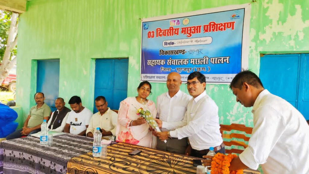 विकासखंड सूरजपुर अंतर्गत शासकीय मत्स्य बीज प्रक्षेत्र बसदेई में विभागीय तीन दिवसीय तकनीकी उन्नयन प्रशिक्षण कार्यक्रम का समापन हुआ। कार्यक्रम की अध्यक्षता श्रीमती स्वाति संत सिंह अध्यक्ष जनपद सूरजपुर ने की, कार्यक्रम के दौरान श्री यशवंत प्रताप सिंह सभापति कृषि स्थाई समिति जनपद सूरजपुर, रामलाल राजवाड़े जी सदस्य कृषि स्थाई समिति, संत सिंह जी, मनोज सिंह जी सरपंच बसदेई, ओमप्रसाद जी सरपंच हरिपुर, गौतम रजवाड़े जी उपसरपंच बसदेई, कैलाश गुप्ता जी, सुरेंद्र गुप्ता जी, विनोद राजवाड़े जी कृषि स्थाई समिति सदस्य प्रतिनिधि, उपस्थित रहे। कार्यक्रम का संचालन श्री एम० एस० सोनवानी, सहायक संचालक मछली पालन जिला सूरजपुर के द्वारा किया गया। उनके द्वारा कार्यक्रम की रूपरेखा एवं प्रशिक्षण के उद्देश्य के बारे में अतिथियों एवं मत्स्य कृषकों को विस्तारपूर्वक बताया गया एवं विभागीय योजनाओं की जानकारी दी गई साथ ही साथ मछली पालन में नई तकनीकों जैसे पौंड लाईनर, RAS, झींगा पालन के बारे में भी जानकारी दिया गया। मछली बीज उत्पादन एवं संवधर्न से संबंधित जानकारी सुधाकर बिसेन, सहायक मत्स्य अधिकारी के द्वारा बताई गई। मछली बीज संचयन , परिवहन, एवं प्रबंधन के बारे में निलेश साहू मत्स्य निरीक्षक प्रतापपुर के द्वारा कृषकों को जानकारी दी गई। मछलियों में रोगों के कारण और निदान से संबंधित जानकारी सनाजीत घोरोई एरिया सेल्स मैनेजर के द्वारा दी गई । प्रशिक्षण में उपस्थित चयनित 03-03 मत्स्य कृषकों को आइस बॉक्स एवं जाल का वितरण भी किया गया। कार्यक्रम पश्चात कृषकों को प्रगतिशील मत्स्य कृषक नरेंद्र सिंह के निजी मछली फार्म का भ्रमण कराया गया जहां उनके द्वारा पौंड लाईनर में मछली पालन का कार्य किया जा रहा है।