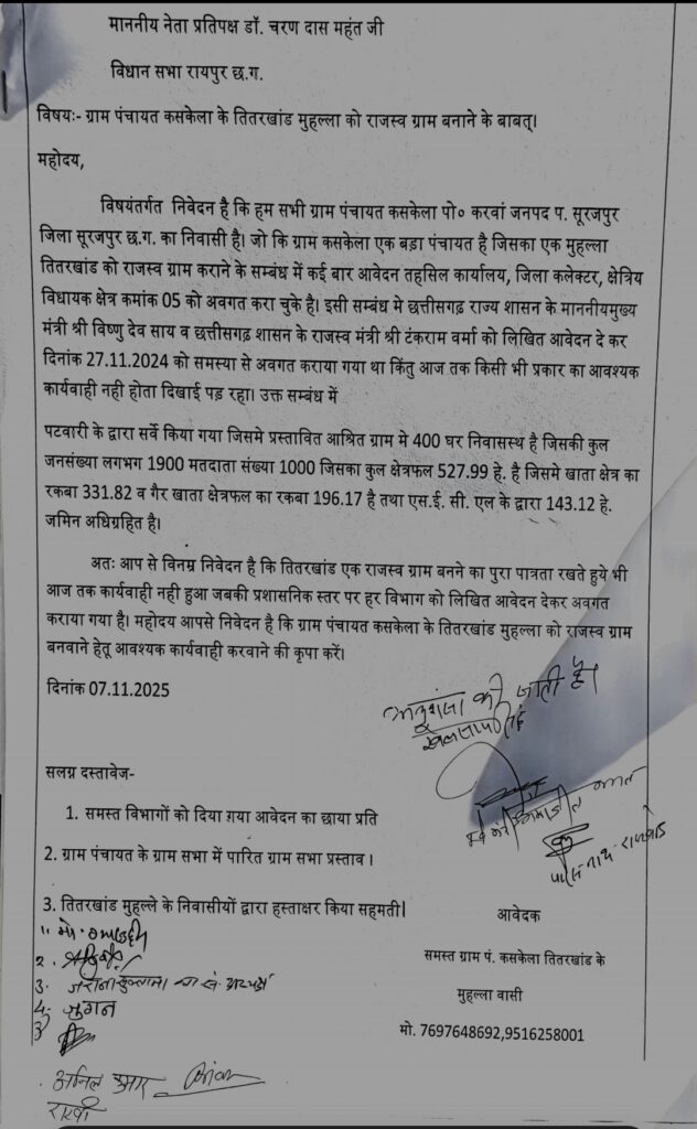 सुरजपूर- जब सत्ता दल किसी की बात न सुने तो मजबुरन् विपक्ष को आपना दुख दर्द सुनाना पडता है ऐसे ही एक बात सामने आई जहाँ के लोगों का कहना है की वर्तमान विधायक व महिला बाल विकास व समाज कल्याण विभाग की मंत्री लक्ष्मी राजवाडे को कई बार् आवेदन ग्राम पंचायत कसकेला के तितरखाड मुहल्ला को आश्रित राजस्व ग्राम बनाने हेतू दे चूके है किंतु आस्वासन के आलावा कुछ नही मिळता, लोगों से बात करने से पता चला की लगभग 5 बार आवेदन दे चुके है ,ये उम्मीद से की मंत्री जी अनुसंसा कर आगे की प्रक्रिया हेतू अग्रेसित करेगी किंतु आज तक केवल निराशा ही हाथ लगी | इसी संबध मे माननीय मुख्यमंत्री विष्णु देव साय ,व राजस्व मंत्री टक राम वर्मा जी के कार्यालय मे भी जाकर आवेदन दे चुके है ।किन्तु कोई कार्यवाही नही हुआ।इससे विवश होकर लगभग 50 की संख्या मे तीतरखांड मुहल्ला के नागरिकों द्वारा नेता प्रतिपक्ष डॉक्टर चरण दास महंत के सूरजपुर प्रवास पर आवेदन पूर्व विधायक पारसनाथ रजवाड़े के अगवाई ने दिये।