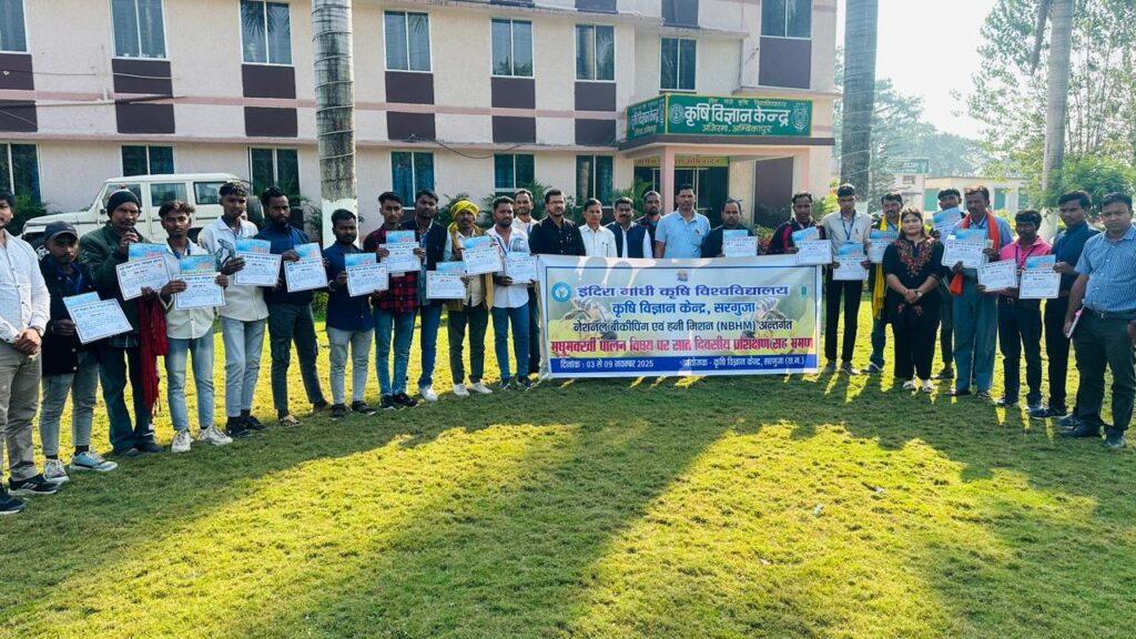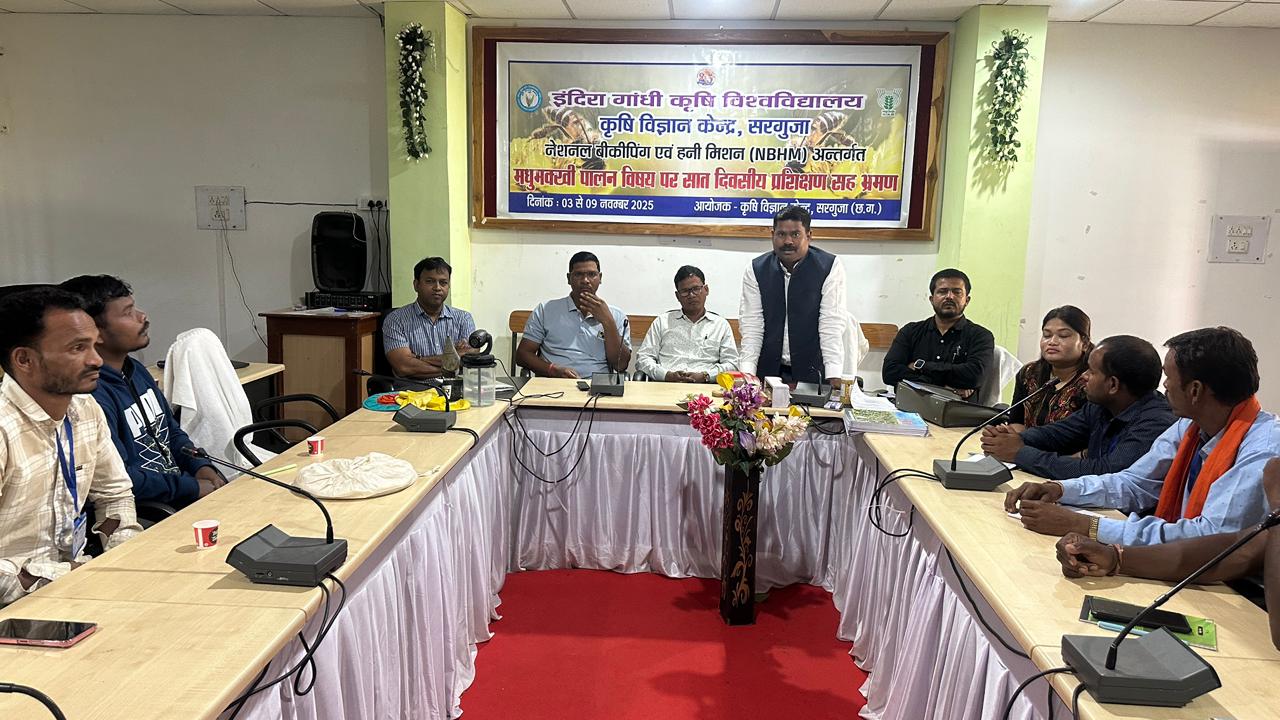 मार्गदर्शन में कृषि विज्ञान केन्द्र सरगुजा के प्रांगण में नेशनल बीकीपिंग एवं हनी मिशन (NBHM) अंतर्गत मधुमक्खी पालन विषय सात दिवसीय प्रशिक्षण 03 नवम्बर से 09 नवंबर तक दिया गया। समापन दिवस पर वर्चुअल माध्यम से ऑनलाइन प्रतापपुर विधायक श्रीमती शकुंतला सिंह पोर्ते भी जुड़ी थी। जहां उन्होंने मधुमक्खी पालन से जुड़ने के कृषक बंधुओं को प्रेरित किया और इससे अतिरिक्त आय का सृजन करने की बात कही ।