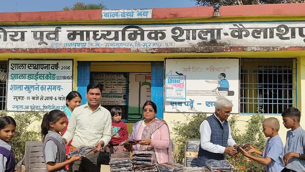 सूरजपुर / विकासखंड रामानुजनगर के शासकीय माध्यमिक शाला कैलाशपुर में शिक्षक श्रीकांत पांडेय के प्रयास से एक सराहनीय सेवामूलक कार्यक्रम का आयोजन किया गया। अपनी माता स्वर्गीय रुकमणी गुप्ता जी की पुण्यतिथि के अवसर पर अनुरुद्ध प्रसाद गुप्ता एवं श्रीमती यशोदा गुप्ता द्वारा विद्यालय के 42 छात्र-छात्राओं को ऊनी स्वेटर वितरित किए गए।