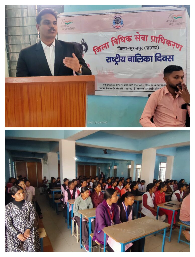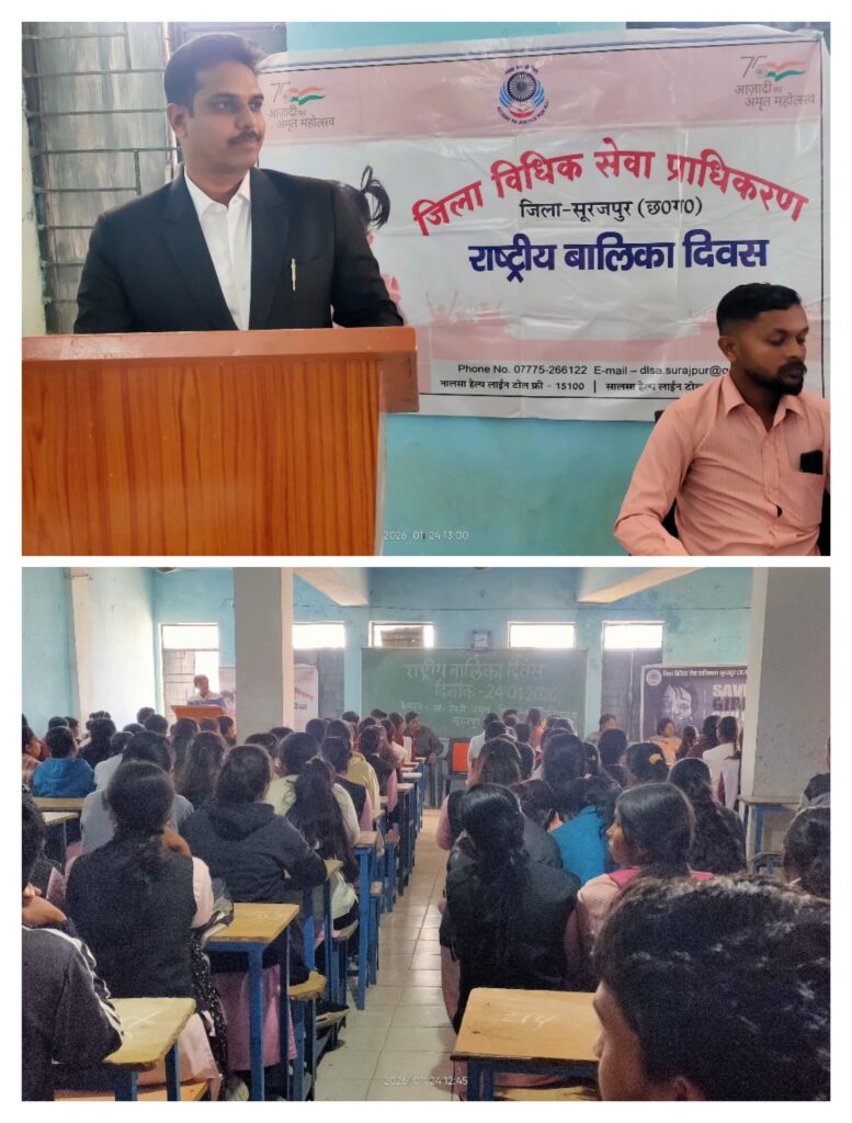 सूरजपुर// लिंग चयन प्रथाओं और बाल विवाह की रोकथाम थीम पर “राष्ट्रीय बालिका दिवस” के अवसर पर जिले के विभिन्न स्कूल कॉलेजों में व्यापक विधिक जागरूकता कार्यक्रम का सफल आयोजन किया गया। मुख्य कार्यकम शासकीय रेवती रमण मिश्र महाविद्यालय सूरजपुर में आयोजित हुआ उक्त कार्यक्रम में शासकीय नवीन कन्या महाविद्यालय के सभी छात्राएं भी हुई शामिल इसके अतिरिक्त इस दिवस पर शासकीय आजाक कन्या माध्यमिक शाला नवापारा, शासकीय हाई स्कूल सूमेरपुर, ग्राम दवनकरा, ग्राम पंचायत टाकर प्रेमनगर, पूर्व मा. शा. कैलासपुर, प्रा.शा.खर्रा, पूर्व मा.वि. बरपारा, शासकी उच्चतर माध्यमिक विद्यालय बड़वार एवं कन्या हायर सेकेण्डरी बिहारपुर में वृहद रूप से कार्यक्रम आयोजित हुए।