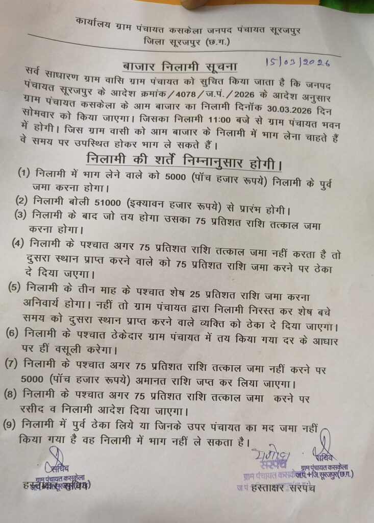 рдЬрд┐рд▓рд╛ рд╕реВрд░рдЬрдкреБрд░ рдХреЗ рдЧреНрд░рд╛рдо рдкрдВрдЪрд╛рдпрдд рдХрд╕рдХреЗрд▓рд╛ рдореЗрдВ рдЖрдЬ рд╕реНрдерд╛рдиреАрдп рд╕рд╛рдкреНрддрд╛рд╣рд┐рдХ рдмрд╛рдЬрд╛рд░ рдХреА рдиреАрд▓рд╛рдореА рдкреНрд░рдХреНрд░рд┐рдпрд╛ рдкрд╛рд░рджрд░реНрд╢реА рдФрд░ рд╢рд╛рдВрддрд┐рдкреВрд░реНрдг рдврдВрдЧ рд╕реЗ рд╕рдВрдкрдиреНрди рд╣реБрдИред рдкрдВрдЪрд╛рдпрдд рдкреНрд░рддрд┐рдирд┐рдзрд┐рдпреЛрдВ рдФрд░ рдЧреНрд░рд╛рдореАрдгреЛрдВ рдХреА рдореМрдЬреВрджрдЧреА рдореЗрдВ рдЖрдпреЛрдЬрд┐рдд рдЗрд╕ рдЦреБрд▓реА рдмреЛрд▓реА рдореЗрдВ рдХрд╛рдлреА рдЙрддреНрд╕рд╛рд╣ рдФрд░ рдкреНрд░рддрд┐рд╕реНрдкрд░реНрдзрд╛ рджреЗрдЦрдиреЗ рдХреЛ рдорд┐рд▓реАред
