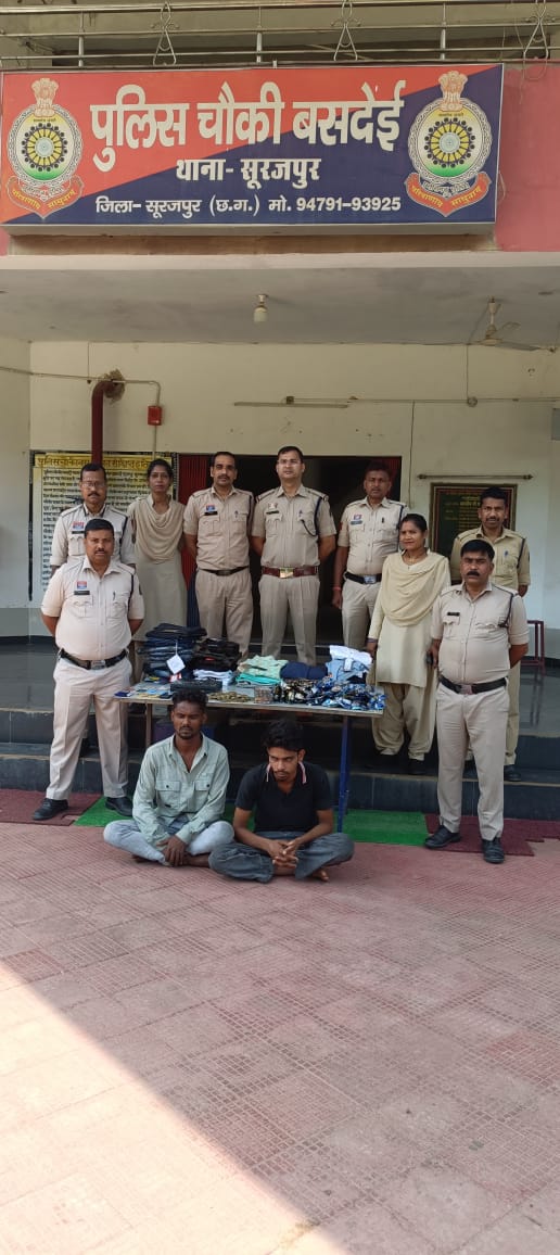 सूरजपुर। जिला सूरजपुर के चौकी बसदेई पुलिस ने ग्राम सोनपुर में हुई एक बड़ी चोरी की गुत्थी सुलझाते हुए दो आरोपियों को गिरफ्तार किया है। पुलिस ने उनके कब्जे से नगदी, सोने के जेवर, कपड़े और सीसीटीवी डीवीआर सहित करीब 93 हजार रूपये का सामान बरामद किया है। आरोपियों के पुराने आपराधिक रिकॉर्ड को देखते हुए पुलिस ने इस मामले में